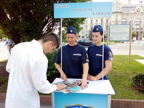 A toborzócsoport munkatársai a győri városháza előtti téren és az egyik bevásárlóközpont előtt szólították meg a rendőri hivatás iránt érdeklődőket.