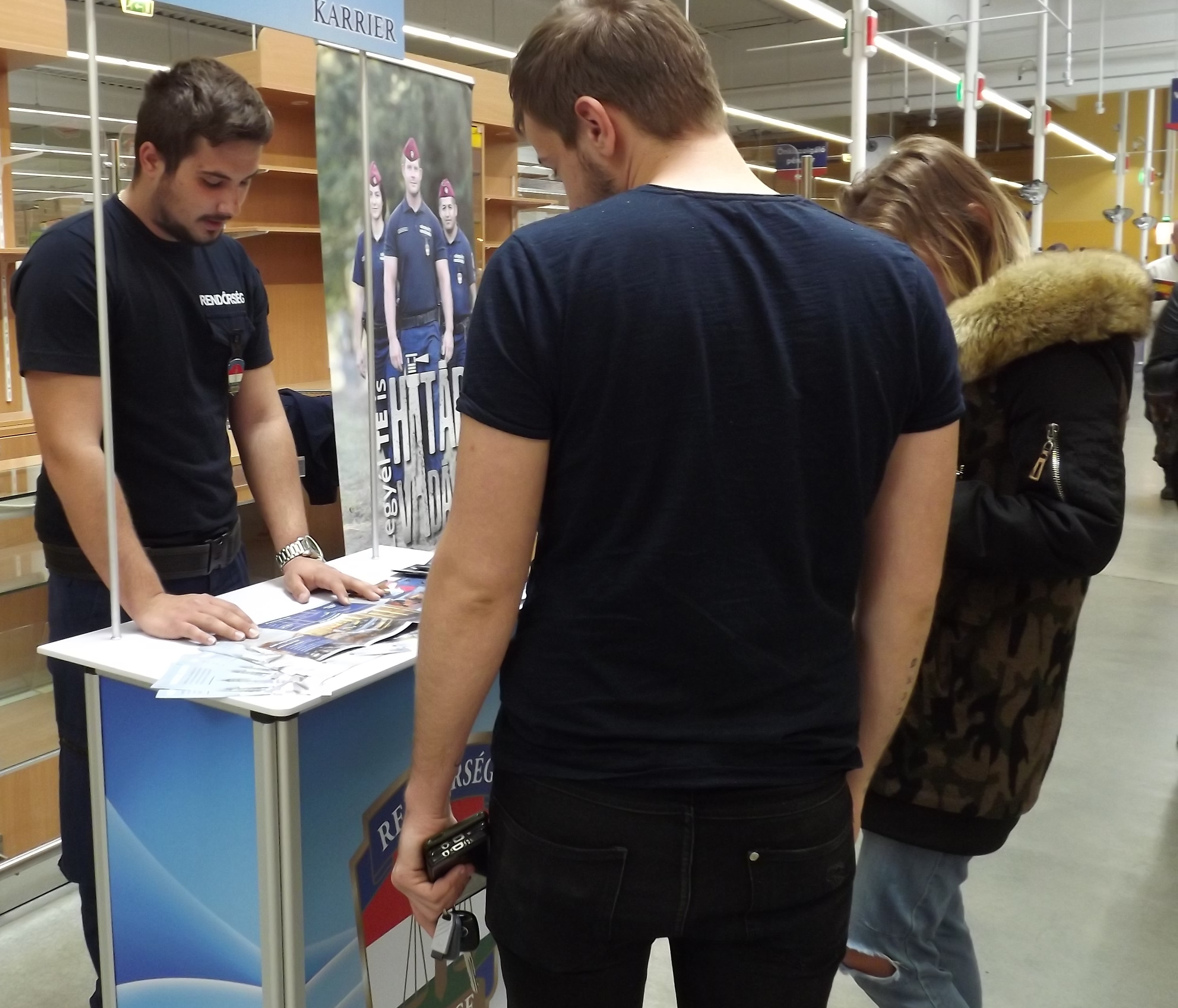 A Várpalotai Rendőrkapitányság toborzó csoportjának tagjai a Készenléti Rendőrség munkatársával 2017. április 9-én délután, a helyi bevásárlóközpontban tájékoztatták az érdeklődőket a határvadász egységbe történő felvétel feltételeiről.