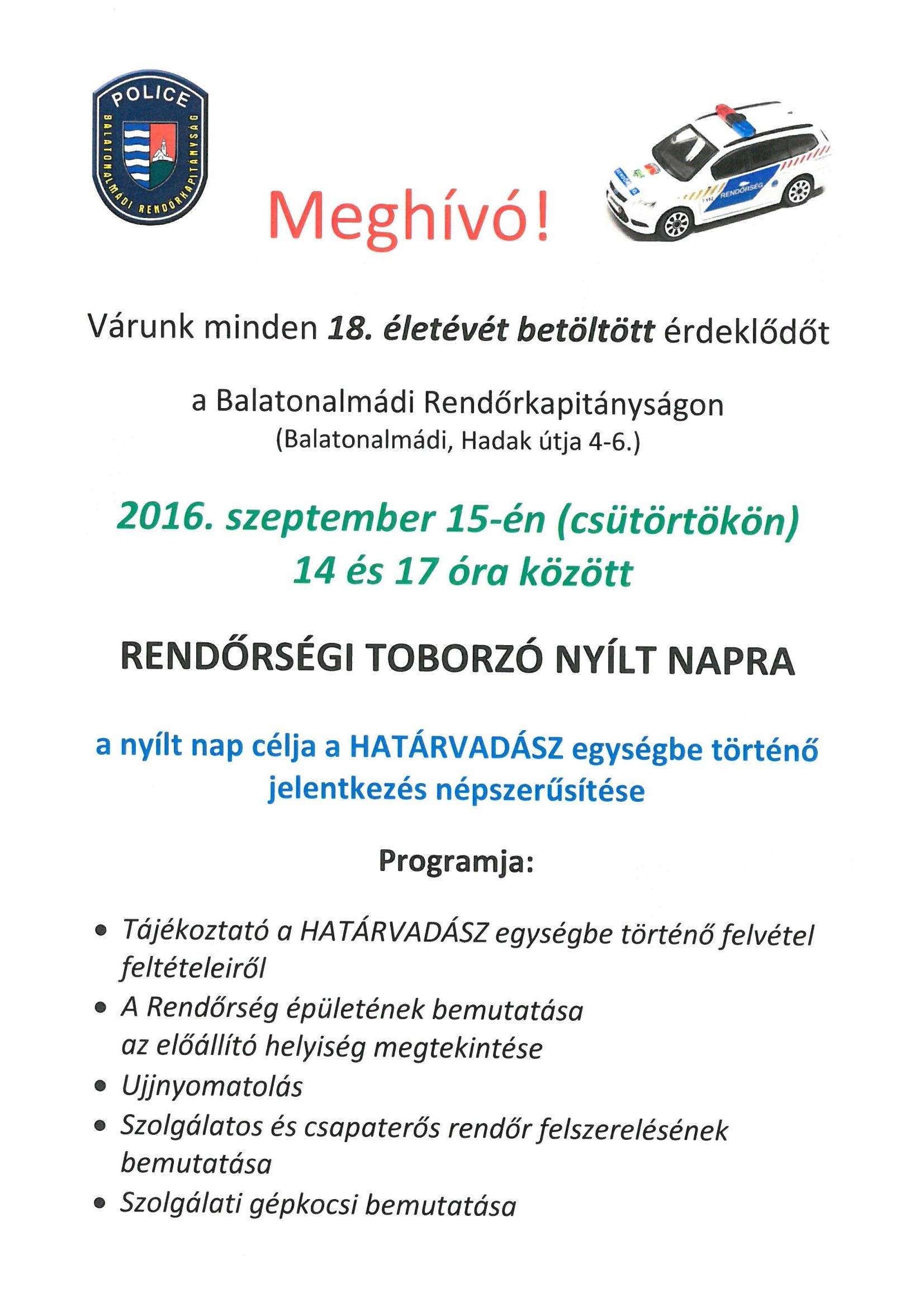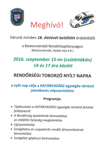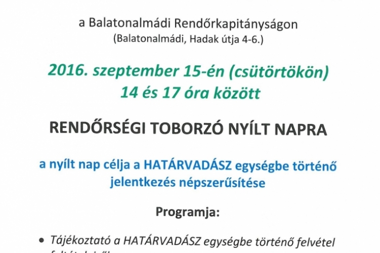 A Balatonalmádi Rendőrkapitányság toborzási céllal szervez nyílt napot 2016. szeptember 15-én 14 és 17 óra között. Ezen a napon elsősorban a 18. életévüket betöltött, érettségivel rendelkező felnőtteket várják a kapitányságon. A rendezvény célja, hogy az érdeklődők közelebbről is megismerkedjenek a rendőrség sokrétű tevékenységével, valamint részletes tájékoztatást kapjanak arról, milyen feltételekkel válhatnak a testület határvédelemi feladatokat ellátó tagjává.