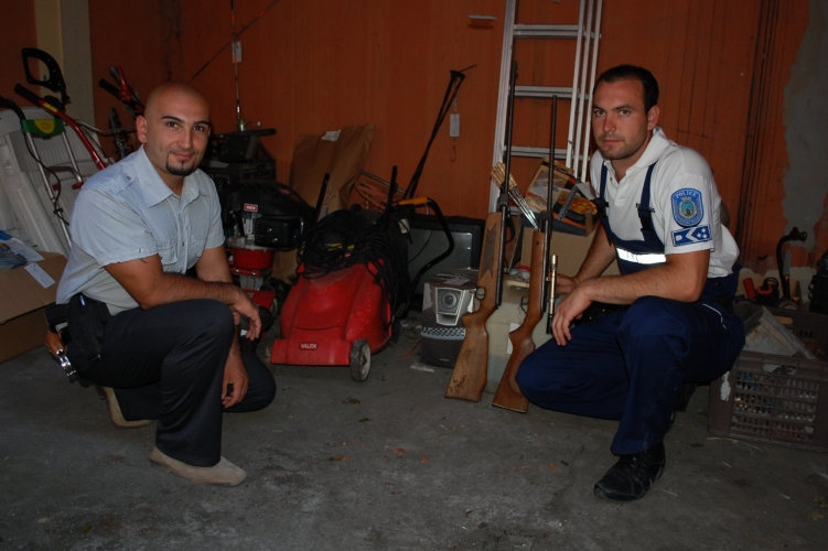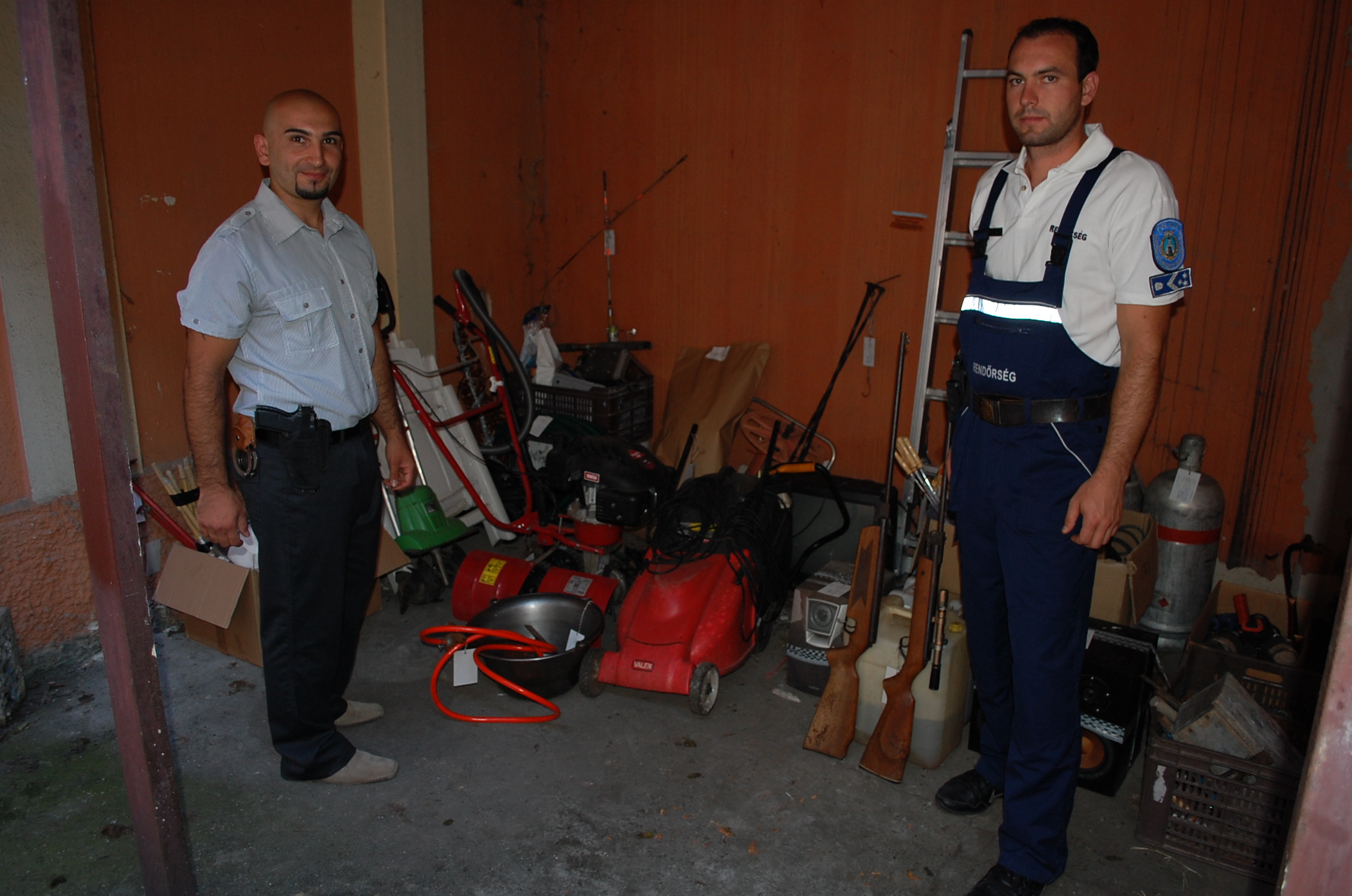 Balról Zámbó István r. ftőrm. nyomozó, jobbról Fekete Roland r. ftőrm. bűnügyi technikus a lefoglalt tárgyak egy részével.