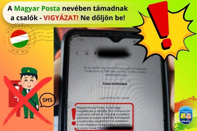 Egy pilismaróti férfi SMS-t kapott a Magyarország Postától november 25-én. Az üzenet szerint csomagja érkezett a raktárba, de a hiányos cím miatt az nem adható ki, ezért frissítse a szállítási adatokat a megadott linken keresztül. A 31 éves gyanútlan sértett valóban csomagot várt, ezért másnap ennek a kérésnek eleget tett. A hivatkozás egy álpostai oldalra vezette, ami a valódihoz megtévesztően hasonlított. Itt módosította a szállítási címét, és a banki adatait is megadta, hogy az ezért járó 500 forintos díjat le tudják tőle vonni. Ezután már fél óra múlva észlelte, hogy az ismeretlen csalók a folyószámlájáról 70 000 forintot levontak. Mivel a feljelentő hamar észrevette a nem kívánt tranzakciót, bankkártyáját azonnal letiltotta.