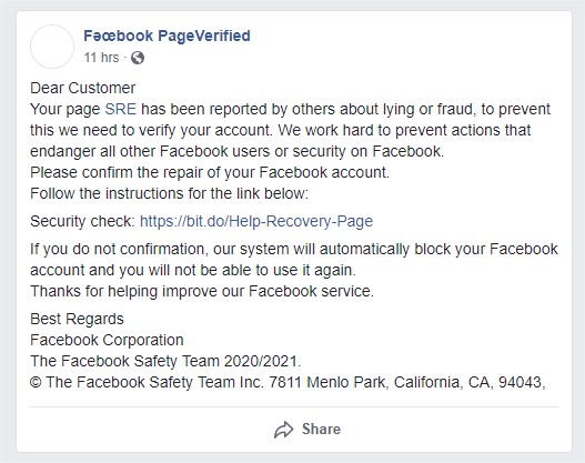 Fontos tudni, hogy a közösségi médiaszolgáltató soha nem publikus- vagy privát bejegyzésben keresi meg az oldalak üzemeltetőit, hanem közvetlenül veszi fel velük a kapcsolatot. Ezért ilyen bejegyzések észlelése esetén ne kattintson az ismeretlen helyre navigáló hivatkozásra, és ne adjon meg semmilyen kért adatot!