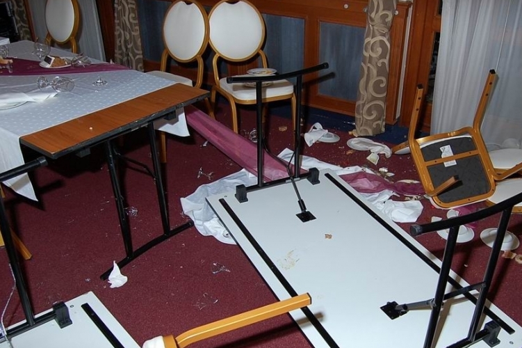 A vitát eleinte próbálták szóban elintézni, de a nézeteltérésük addig fajult, hogy a vitapartnerek lökdösődni, dulakodni kezdtek. A dulakodás során asztalokat borítottak fel, tányérokat, poharakat, asztali díszeket törtek össze, de még egy széket is egymás felé hajítottak. A verekedésnek a kiérkező járőrök vetettek végett.