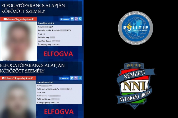 Egy többszörösen körözött 46 éves nőt és egy évtizedes bűnügyi múlttal rendelkező 36 éves férfit fogtak el a holland hatóságok. A két körözött tartózkodási helyét a Készenléti Rendőrség Nemzeti Nyomozó Iroda (KR NNI) a hevesi és a jászsági nyomozókkal közösen derítette fel.