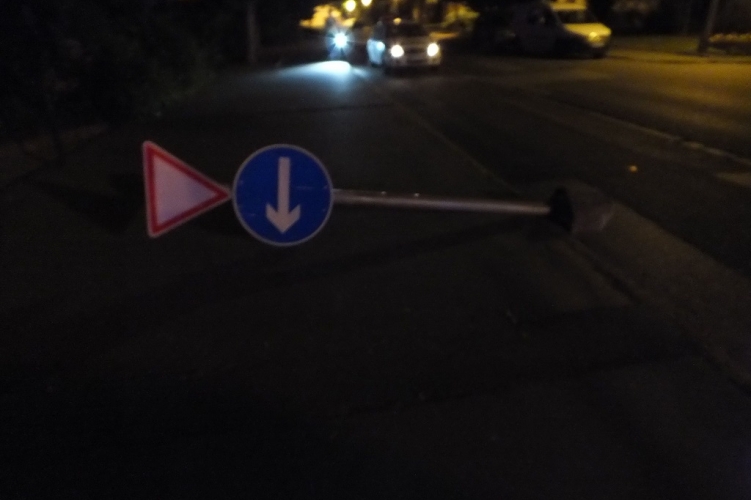 A helyszínen kiderült, hogy a jelzőtáblát a földből eltávolították, majd több mint ötven méteren át húzták az úttesten és egy buszmegállóban hagyták.