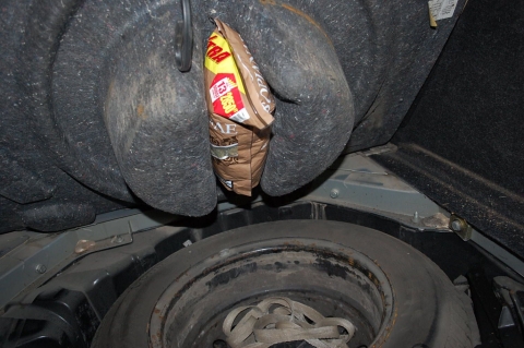 A győri járőrök 2014. november 14-én 20 óra 15 perckor közúti ellenőrzésen igazoltatták a Renault gépkocsit és utasait. Az autó csomagterének átvizsgálásakor a pótkerék alatt elrejtve egy dohányzacskót találtak. A 25 éves sofőr és 14 éves utasa elmondta, hogy a csomagban lévő 300 gramm növényi töremelék marihuána. Komáromból hozták és Győrben akarják értékesíteni. Beismerték, alkalomszerűen fogyasztanak kábítószert. Az egyenruhások a két nagyigmándi fiatalt a Győri Rendőrkapitányságra előállították, a marihuánát lefoglalták.