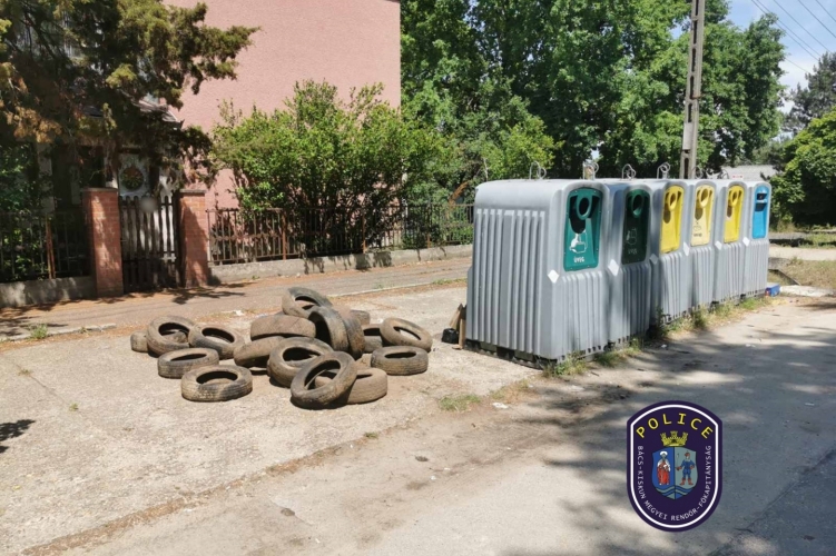 A tiszakécskei rendőrök járőrözés közben figyeltek fel idén június 5-én arra, hogy 20-25 darab gumiabroncsot helyezett el egy ismeretlen személy a településükön lévő egyik szelektív hulladékgyűjtő mellett.