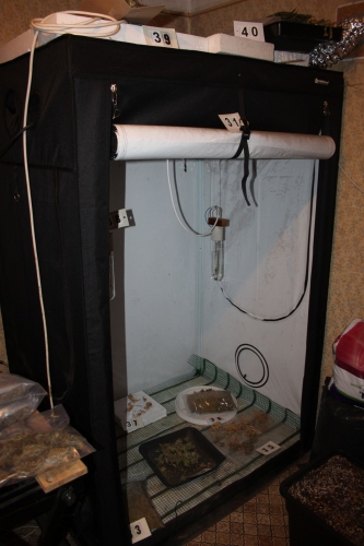 A bevezetett nyomozati cselekmények eredményeként a rendőrök megtalálták azt a lakást, ahol a férfi a kábítószert tárolta. A házkutatás során két kábítószer termesztéséhez kialakított fóliasátrat találtak a nyomozók, mellette pedig a már bezsákolt és „leszüretelt” növényt. A pincét a férfi kannabisz neveléséhez alakította át, a falakat lefóliázta, a növények fejlődéséhez pedig egy speciális öntözőrendszert épített ki. Az alagsori kertészetben a rendőrök kannabisz cserjéket is találtak. A nyomozók összesen 3341 gramm kábítószergyanús növényi törmeléket, 22 gramm növénymagot és 15 tő kannabisz növényt foglaltak le.