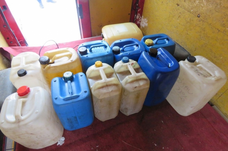 Rétság külterületén, a 2-es számú főúton parkoló tehergépkocsikból lopott üzemanyagot a két férfi.