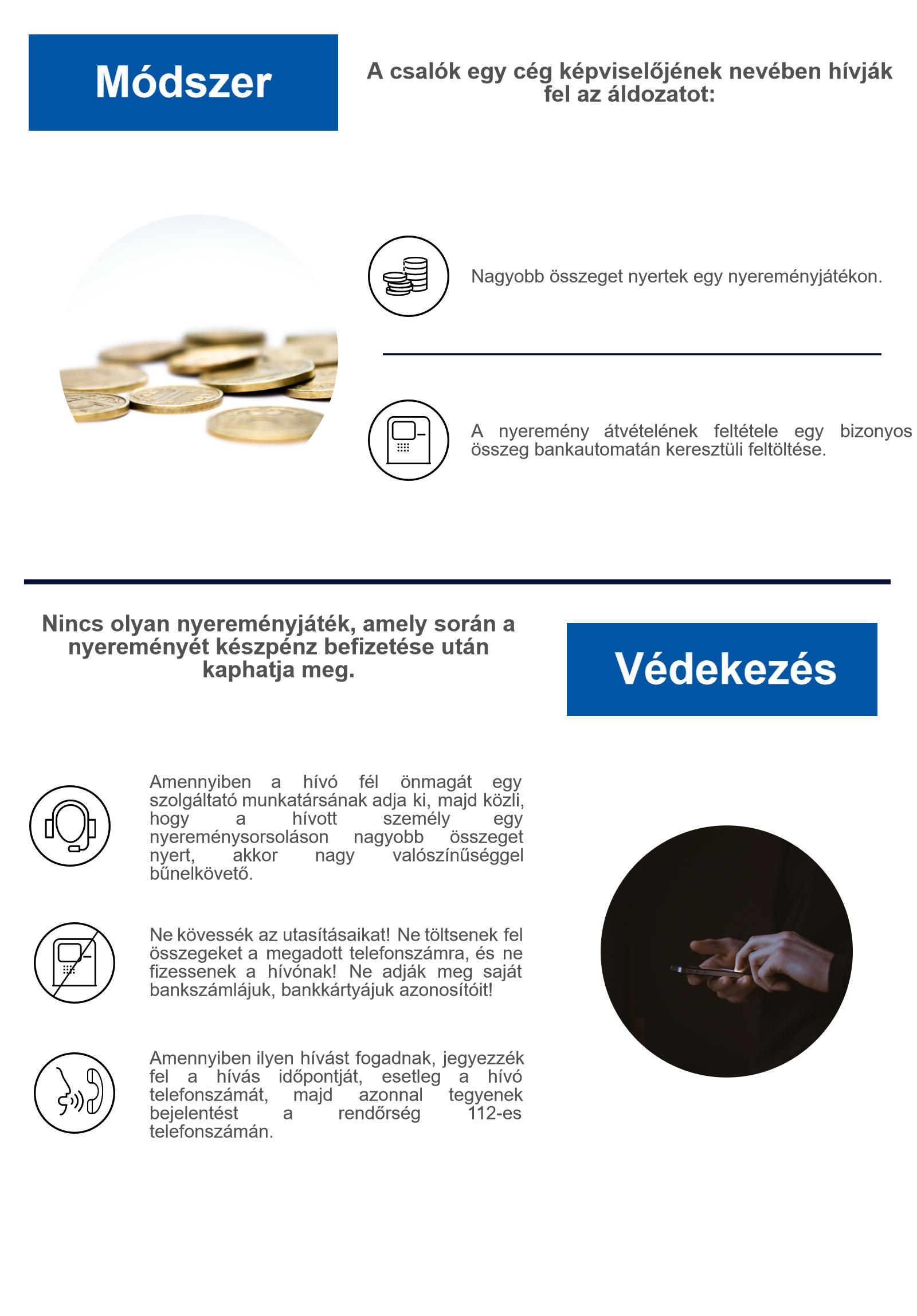Több száz embert károsítottak már meg országszerte a bűnözők úgy, hogy valamelyik mobilszolgáltató cég vagy a Szerencsejáték Zrt. nevében hívták fel őket – ismertette a módszer lényegét a tábornok. A csalók legtöbb esetben azt mondták, hogy a hívott fél nagyobb pénzösszeget nyert, de hivatkoztak már nyaralásra vagy lakásnyereményre is. A sértettől a nyereményért cserébe azt kérték, hogy egy megadott mobiltelefon egyenlegét töltse fel. Az is előfordult, hogy egy bediktált kódot kellet a sértettnek beütnie egy bankautomatánál – amiről utólag kiderült, hogy valójában szintén egy feltöltendő mobiltelefonszám volt. Olyan is volt, akit arra tudtak rávenni, hogy regisztrációs díjként egy bankszámlára utaljon pénzt.