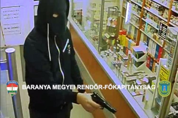 Fegyveresen elkövetett rablás bűntett miatt nyomozott a Baranya Megyei Rendőr-főkapitányság az ellen a 32 éves pécsi férfi ellen, aki 2017 nyarán maszkban, egy műanyag pisztollyal négy pécsi dohányboltot rabolt ki. Sz. Barnabást a rendőrök 2017. augusztus 23-án este fogták el, amikor ismét egy dohányboltot akart kirabolni Pécsett. Az elfogásakor megtalálták nála a rablások során használt ruházatot, csuklyát és fegyverutánzatot is. A férfi gyanúsítotti kihallgatásán elismerte a bűncselekmények elkövetését.