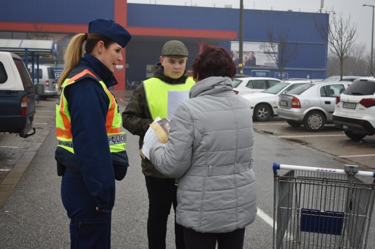 A rendőrök az adventi időszakban gyakrabban előforduló alkalmi lopások, zsebtolvajlások megelőzési lehetőségeiről tájékoztatták a vásárlókat közösségi szolgálatos diákok közreműködésével 2019. december 12-én délután.
