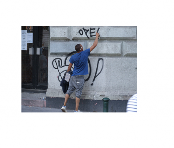 A rendelkezésre álló adatok alapján egy ismeretlen férfi 2019. június 6-án 18 óra és 18 óra 30 perc között Budapest VI. kerületében, az Oktogon tér 4. szám alatti épületet összefestette.