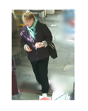 Az elkövető 40 év körüli, szőke hajú, szemüveges nő. A bűncselekmény elkövetésekor fehér sportcipőt, fekete nadrágot, lila kabátot és zöld sálat viselt.