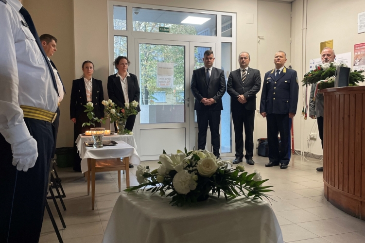 A főkapitányság képviseletében Szabó Csaba r. dandártábornok, vármegyei rendőrfőkapitány helyezte el a tisztelet koszorúját, és gyújtotta meg az emlékezés gyertyáját.