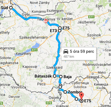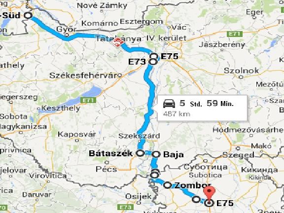 Nickelsdorf (Österreich) - Hegyeshalom (Einreise nach Ungarn/E75/Autobahn M1) – Südum-fahrung von Budapest (M0) – E73 (Autobahn M6) – Hauptstarße 55 (Bátaszék) – Hauptstra-ße 51 (Baja) – Grenzübergang Hercegszántó (2 PKW-Spuren bei der Ausreise) – Bački Breg (Einreise nach Serbien). Weiter Richtung Hauptstarße 15 und Verkersstraße 101 (Sombor (Coмбop) – Kula (Kyлa) – Hauptstarße 3 – Vrbas (Bpбac) und E75 (Autobahn A1).