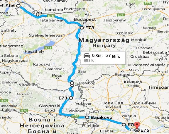 Nickelsdorf (Österreich) - Hegyeshalom (Einreise nach Ungarn/E75/Autobahn M1) – Südum-fahrung von Budapest (M0) – Grenzübergang Udvar (2 PKW-Spuren bei der Ausreise) – Duboševica (E73/Einreise nach Kroatien) – E70 (Autobahn A2) – Bajakovo (E70/Einreise nach Serbien) – Belgrad (E75).