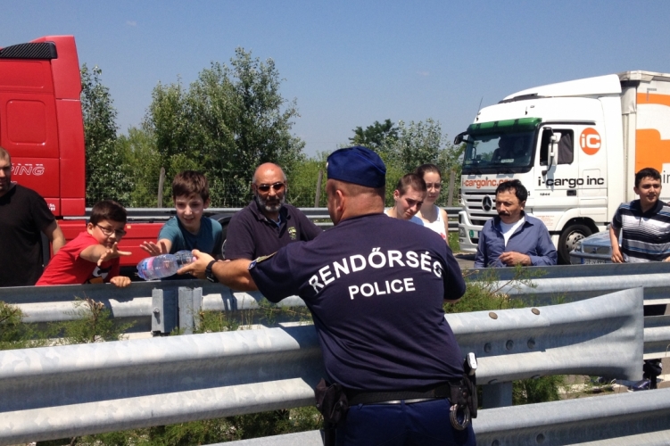 A Vöröskereszt és a rendőrség önkéntesei Röszkén továbbra is vizet osztanak a sorban várakozóknak.