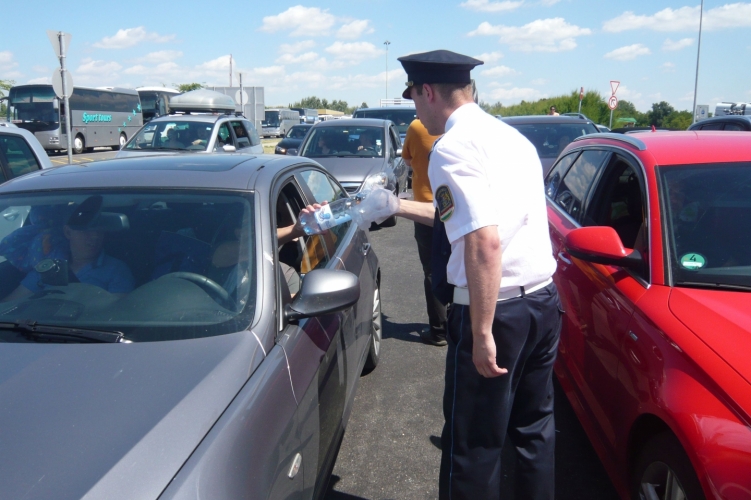 A határátkelőhelyen szolgálatot teljesítő rendőrök 2017. július 29-én, a forróságban ismét hűtött ásványvizet osztanak a sorban álló, átlépésre várakozó utasoknak. A négyórás várakozás szombat délelőttre alakult ki. Az átkelőhely teljes kapacitással működik annak érdekében, hogy a határátlépés minél gördülékenyebben történjen.