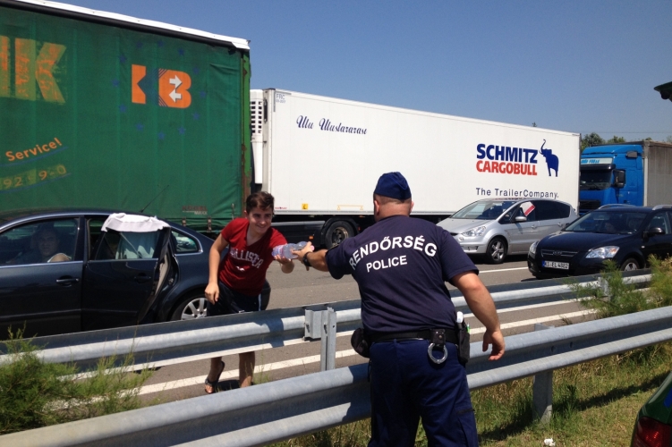 A rendőrök és a Magyar Vöröskereszt önkéntesei folyamatosan vizet osztanak a várakozóknak Röszkénél.
