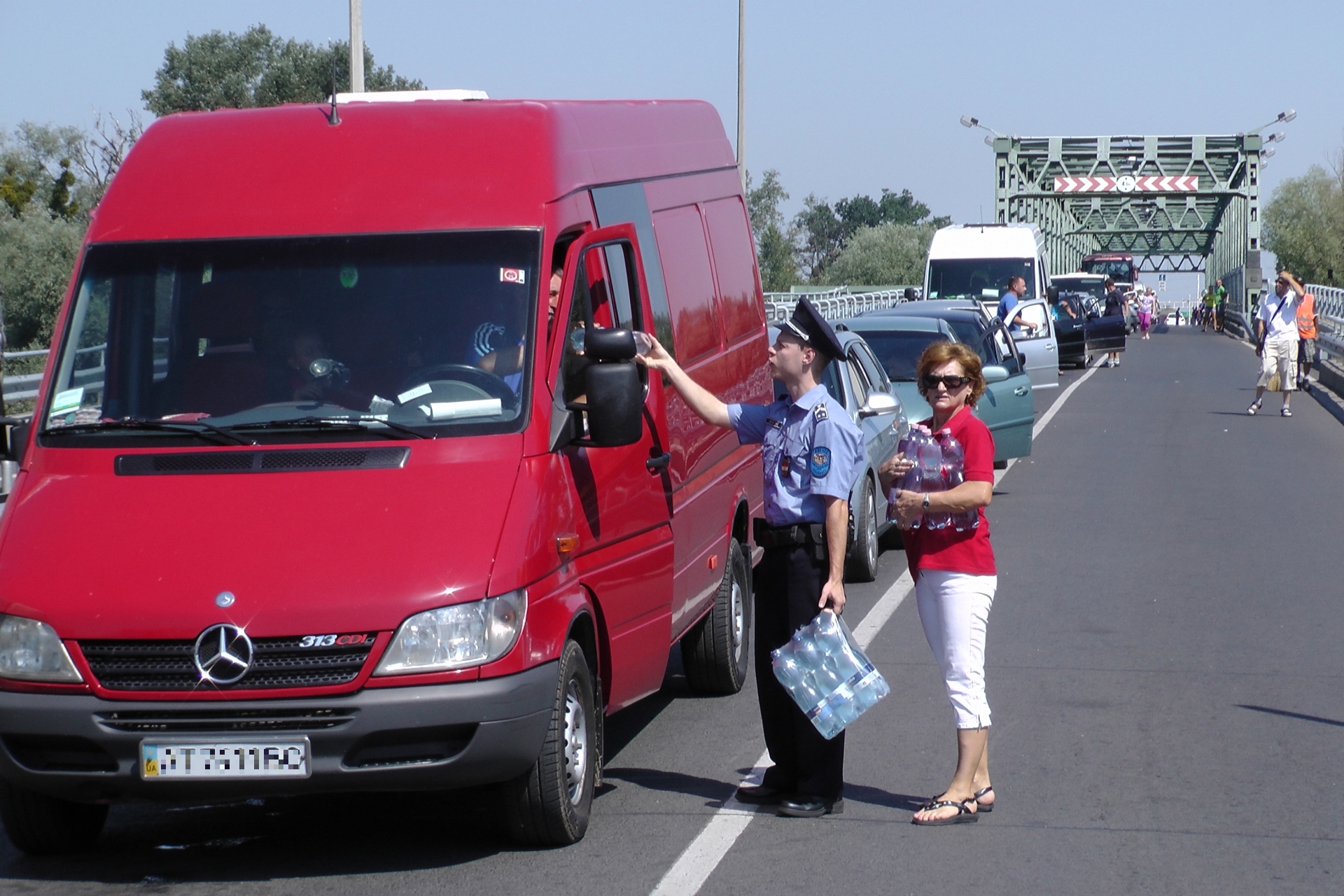 A záhonyi határátkelőnél belépésre várakozóknak jól esik a hűsítő segítség.