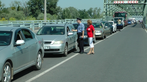 A záhonyi közúti határátkelőhelyen a sorban várakozóknak osztottak hűtött ásványvizet a Szabolcs-Szatmár-Bereg Megyei Rendőr-főkapitányság Záhonyi Határrendészeti Kirendeltsége és a Magyar Vöröskereszt munkatársai 2015. július 23-án délelőtt.