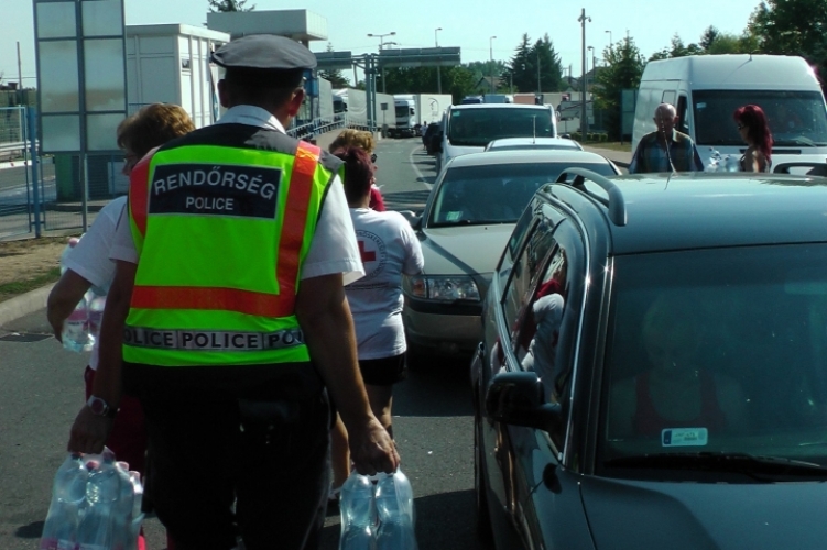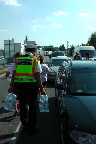 A záhonyi közúti határátkelőhelyen a rendőrök és a Magyar Vöröskereszt önkéntesei a rendkívüli hőségre tekintettel hűtött ásványvizet osztottak 2015. augusztus 8-án az átlépésre várakozó utasoknak.