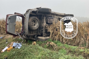 A személygépjármű eddig ismeretlen okból letért az útról és felborult.