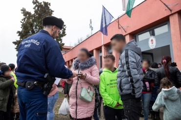 Magyar rendőrök segítenek az Ukrajnából érkezett menekülteknek.