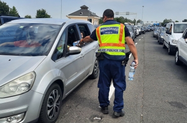 Hűtött ásványvízzel kínálták a rendőrök a Röszke Autópálya-határátkelőhelyen kilépésre várakozó utasokat, ahol vasárnapra ötórás sor alakult ki.