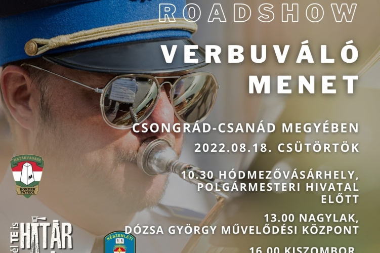 A héten Csongrád-Csanád megyében folytatódik a Készenléti Rendőrség Zenekarának verbuváló menete. A roadshow-n a megyei toborzók is részt vesznek, akik várják a szerződéses határvadászképzés iránt érdeklődőket.