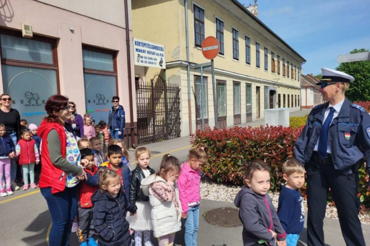 A Mosonmagyaróvári Rendőrkapitányság Közlekedésrendészeti Osztályának balesetmegelőzési referense, Családi Katalin rendőr törzszászlós játékos formában tartott foglalkozást az óvodásoknak, amelynek célja a gyerekek biztonságérzetének növelése, a jelzőtáblák megismerése volt.