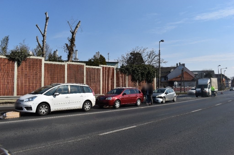 Személyi sérüléssel járó közúti közlekedési baleset történt Győrben, a 821-es számú úton 2021. március 10-én 11 óra 38 perckor. A rendelkezésre álló adatok szerint egy 41 éves győri férfi közlekedett személygépkocsival a Nádor tér felől, a Benczúr utca irányába. Haladása során nem tartott kellő követési távolságot az előtte közlekedő autó mögött, amelynek következtében a forgalmi okból megálló járműnek ütközött. A balesetet okozó gépjármű mögött haladó személygépkocsi a karambolt észlelve megállt, azonban az utánuk érkező tehergépjárművet vezető 22 éves mosonmagyaróvári férfi szintén nem tartotta be a követési távolságra vonatkozó szabályokat, amelynek következtében az előtte megálló autónak ütközött. Az álló gépkocsik az ütközés hatására egymásnak csapódtak. A baleset során az egyik személygépkocsi sofőrje megsérült, ezért őt a mentők kórházba vitték.