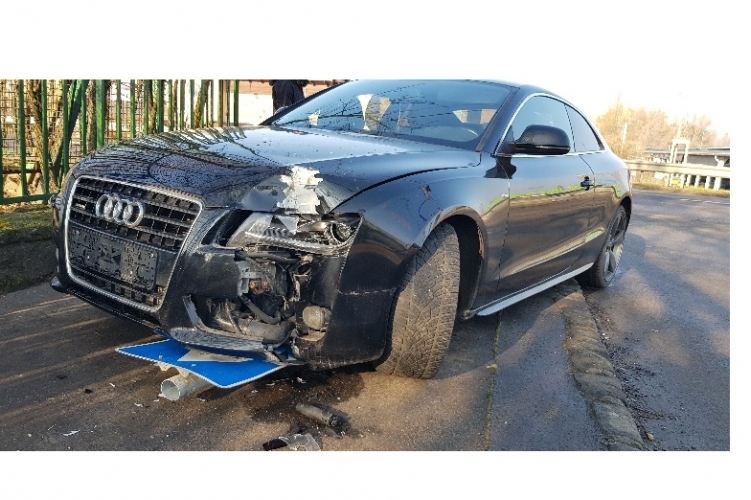 A fenti képen az egyik balesetben összetört autó látható. Két gépkocsi ütközött össze 2021. február 22-én 7 óra 20 perc körül Budapest XVIII. kerületében, a Haladás utcában. Ebben a balesetben senki nem sérült meg.