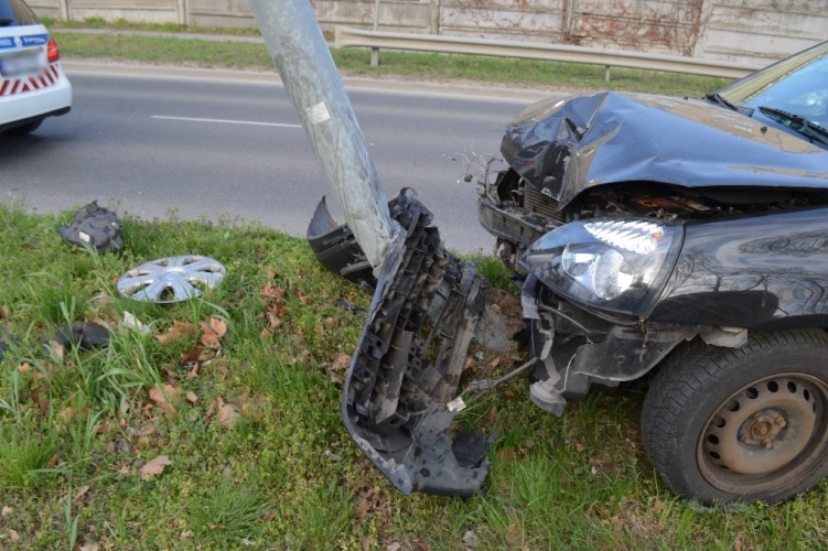 A fenti képen az egyik balesetben összetört autó látható. Egy személygépkocsi 2021. március 31-én 7 óra 10 perc körül Budapest XI. kerületében, a Hunyadi János úton a forgalmi irányokat elválasztó szigetre hajtott, majd oszlopnak ütközött. Ebben a balesetben egy ember könnyebben megsérült.