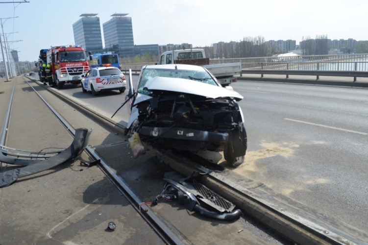 A fenti képen az egyik balesetben összetört autó látható. Eddig tisztázatlan körülmények között 2021. április 2-án 12 óra körüli időben egy autó Budapest XIII. kerületében az Árpád hídon haladva a zárt villamos sínpályára hajtott, majd a felsővezeték-tartó oszlopnak ütközött. Ebben egy ember könnyebben sérült meg.