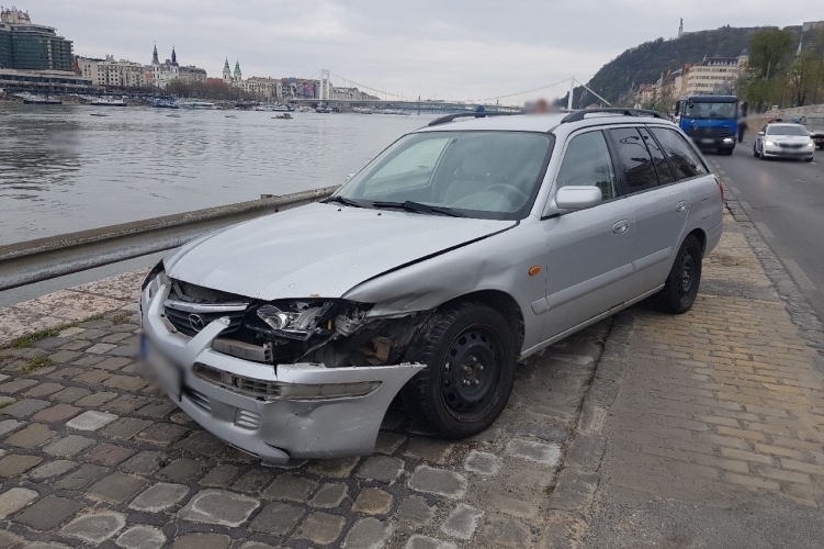 A fenti képen az egyik balesetben összetört autó látható. Két autó ütközött össze 2021. április 16-án 12 óra körül Budapest I. kerületében, a Friedrich Born rakparton. Ebben a balesetben nem sérült meg senki.