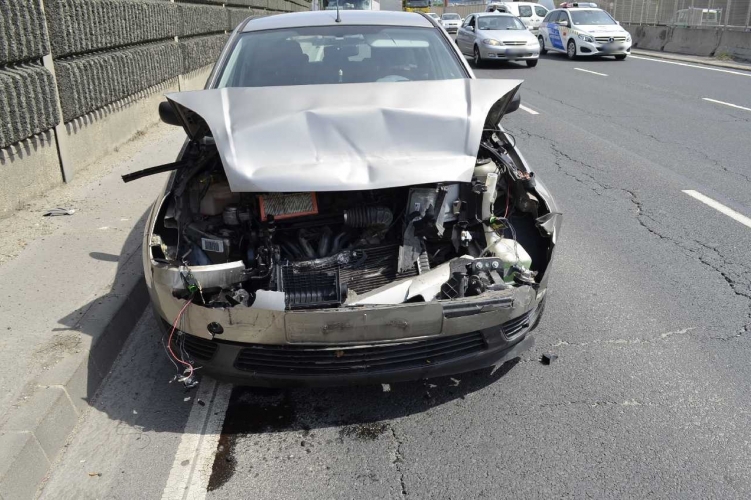 A fenti képen az egyik balesetben összetört autó látható. Két autó ütközött össze 2021. május 15-én 10 óra körül Budapest XV. kerületében, az M3-as autópálya bevezető szakaszán. Ebben a balesetben egy ember könnyebben sérült meg.