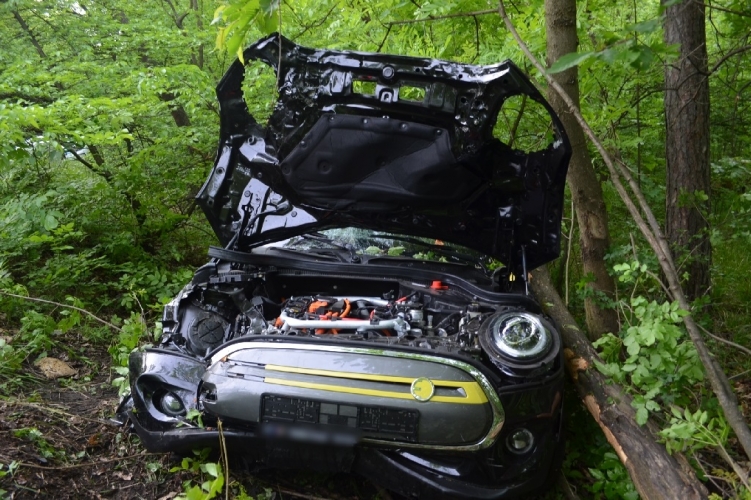 A fenti képen az egyik balesetben összetört autó látható. Eddig tisztázatlan körülmények között 2021. május 19-én 4 óra 42 perckor egy személygépkocsi Budapest III. kerületében a Hármashatárhegyi úton haladva kisodródott, majd egy fának ütközött. Ebben a balesetben egy ember könnyebben megsérült.