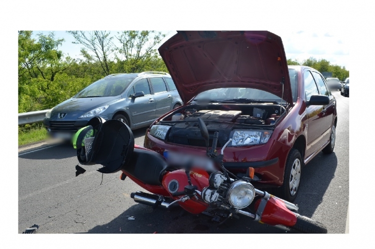 A fenti képen az egyik balesetben összetört autó és motor látható. Két gépkocsi és egy motor ütközött össze 2021. május 27-én 15 óra 8 perc körül Budapest XVII. kerületében, a Pesti úton. Ebben a balesetben egy ember szenvedett könnyű sérülést.