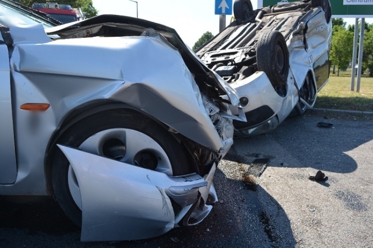 A fenti képen az egyik balesetben összetört két jármű látható. Két autó ütközött össze 2021. június 26-án 8 óra 45 perc körül Budapest XXIII. kerületében, a Bevásárló utcában. Az ütközés következtében az egyik autó a tetejére borult. Ebben a balesetben egy ember könnyebben megsérült.
