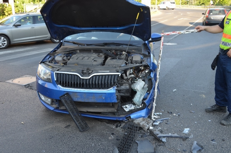 A fenti képen az egyik balesetben összetört autó látható. Két autó ütközött össze 2021. július 7-én 6 óra körül Budapest XIII. kerületében, a Népfürdő utca és a Dagály utca kereszteződésében. Ebben a balesetben egy ember sérült meg könnyebben.