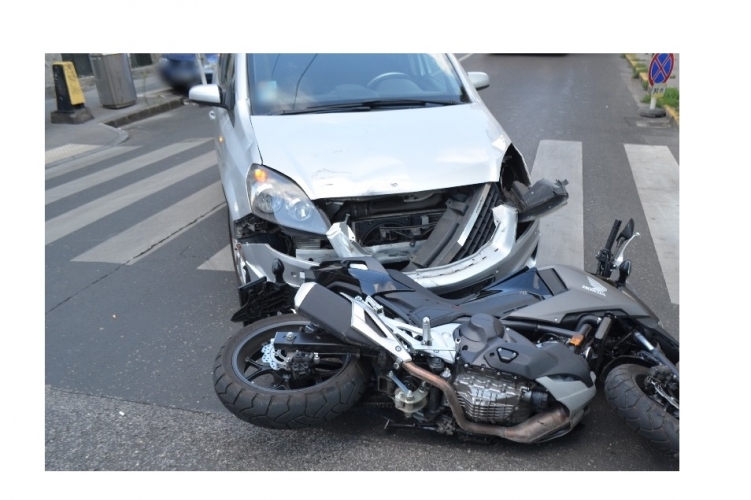 A fenti képen az egyik balesetben összetört autó és motor látható. Egy gépkocsi és egy motor ütközött össze 2021. augusztus 2-án 6 óra 15 perc körül Budapest VII. kerületében, az Izabella utca és a Dob utca kereszteződésében. Ebben a balesetben egy ember könnyebben megsérült.
