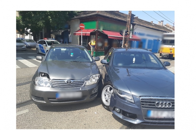 A fenti képen az egyik balesetben összetört két autó látható. Két gépkocsi ütközött össze 2021. augusztus 8-án 12 óra 30 perc körül Budapest IV. kerületében, az István utca és a Lőrincz utca kereszteződésében. Ebben a balesetben senki nem sérült meg.