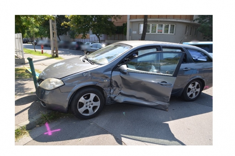 A fenti képen az egyik balesetben összetört autó látható. Két gépkocsi ütközött össze 2021. augusztus 14-én 11 óra körül Budapest XIII. kerületében, a Röppentyű utca és a Frangepán utca kereszteződésében. Ebben a balesetben egy ember könnyebben megsérült.