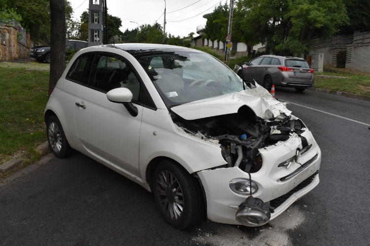 A fenti képen az egyik balesetben összetört autó látható. Egy autó teherautóval ütközött össze 2021. augusztus 23-án 12 óra 45 perc körül Budapest II. kerületében, a Pusztaszeri út és Alsó Zöldmáli út kereszteződésében. Ebben a balesetben egy ember sérült meg könnyebben.