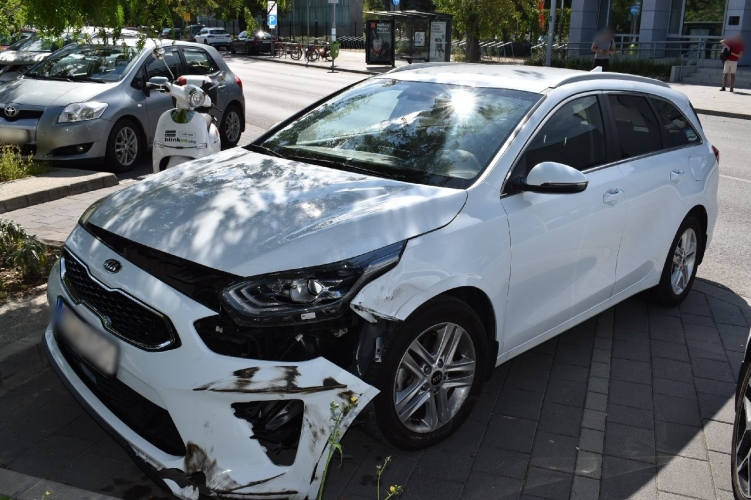 A fenti képen az egyik balesetben összetört személygépkocsi látható. Eddig tisztázatlan körülmények között ütközött össze két autó 2021. augusztus 29-én 14 óra körül Budapest XIII. kerületében, a Népfürdő utcában. Ebben a balesetben senki nem sérült meg.