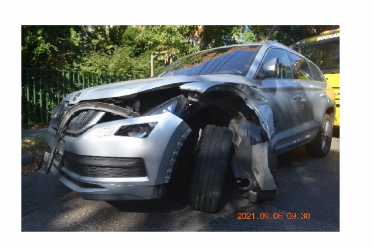 A fenti képen az egyik balesetben összetört autó látható. Eddig tisztázatlan körülmények között ütközött össze két autó 2021. szeptember 6-án 8 órakor Budapest XI. kerületében, a Sasadi úton. Ebben a balesetben négy ember könnyebben sérült meg.