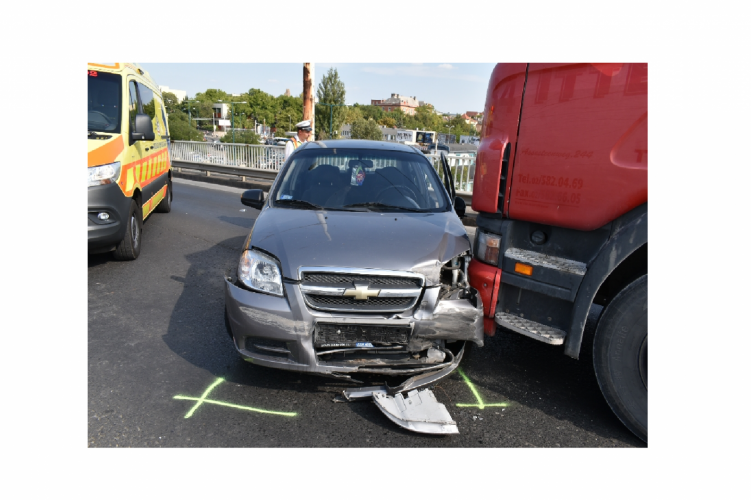 A fenti képen az egyik balesetben összetört autók láthatók. Eddig tisztázatlan körülmények között ütközött össze egy autó és egy teherautó 2021. szeptember 14-én 13 óra 46 perckor kor Budapest XIV. kerületében, a Kacsóh Pongrác úti felüljárón. Ebben a balesetben három ember könnyebben sérült meg.