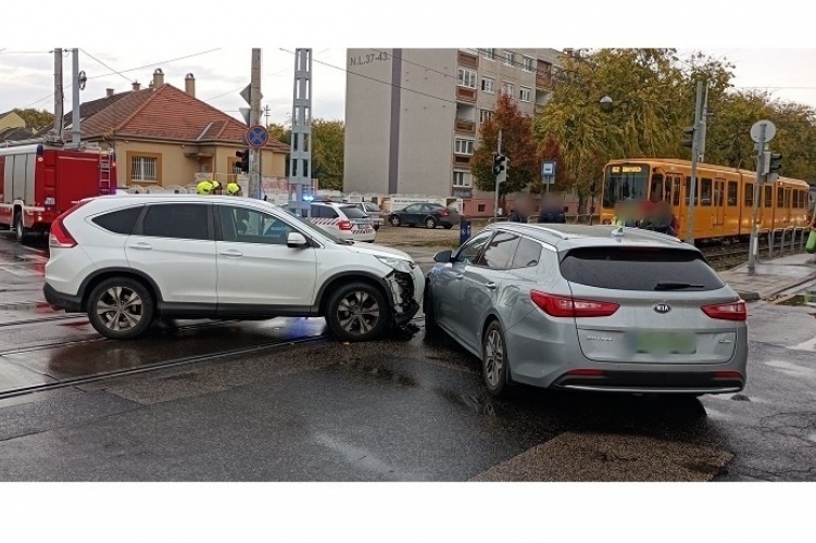 A fenti képen az egyik balesetben összetört autók láthatók. Két autó ütközött össze 2021. november 2-án 7 óra 10 perckor Budapest XIV. kerületében, a Nagy Lajos király útja és a Fogarasi út kereszteződésében. Ebben a balesetben nem sérült meg senki.